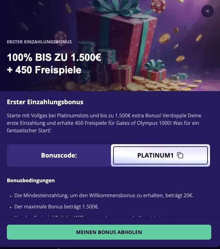 Nach der Registrierung haben Neukunden mit dem ersten Platinumslots Casino Bonus die Option, ein Willkommenspaket zu beanspruchen. Am Start gibt es 100 % bis zu 1.500 € plus 450 Free Spins für Gates of Olympus 1000. Mindestens 20 € müssen eingezahlt werden, aktiviert wird der Bonus mit dem Code PLATINUM1. Bestandskunden erwartet eine Vielzahl an Aktionen, darunter u. a. Super Spins am Montag und ein Reload Bonus am Freitag. Wir beschreiben im Folgenden, worum sich Boni handeln können, wie sie aktiviert werden können.