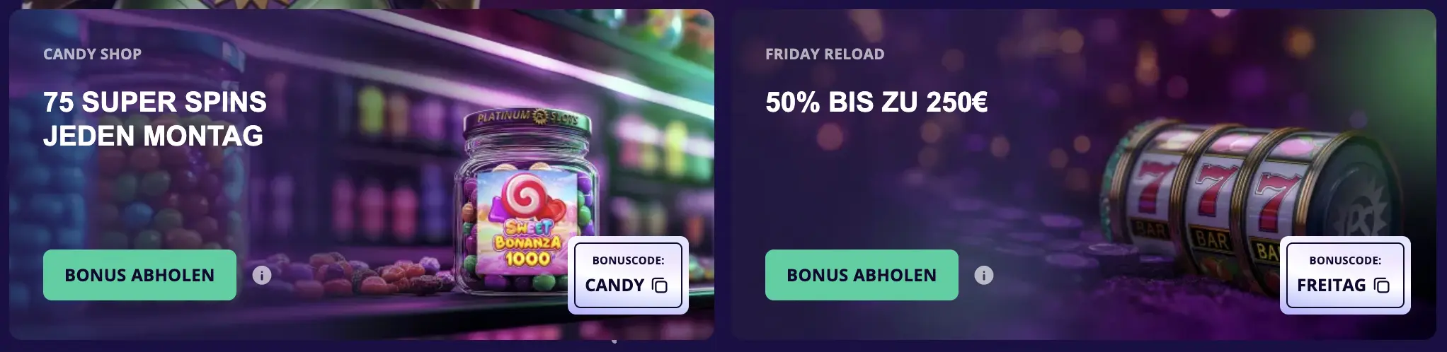 Ein Reload Angebot ist ein regelmäßig wiederkehrendes Ereignis. Ein Kunde kann also mehr als einmal profitieren. Unser Friday Reload ist mit dem Platinumslots Promo Code FREITAG nur an dem genannten Tag aktivierbar. Es geht um 50 % bis zu 250 €, wobei der Mindestbetrag bei 20 € liegt. Das Konto kann durch eine Aktivierung in Verbindung mit einer geleisteten Einzahlung neu aufgeladen werden, denn das ist die deutsche Übersetzung für einen Reload Bonus. Durch den genannten Voucher besteht eine Wahl.