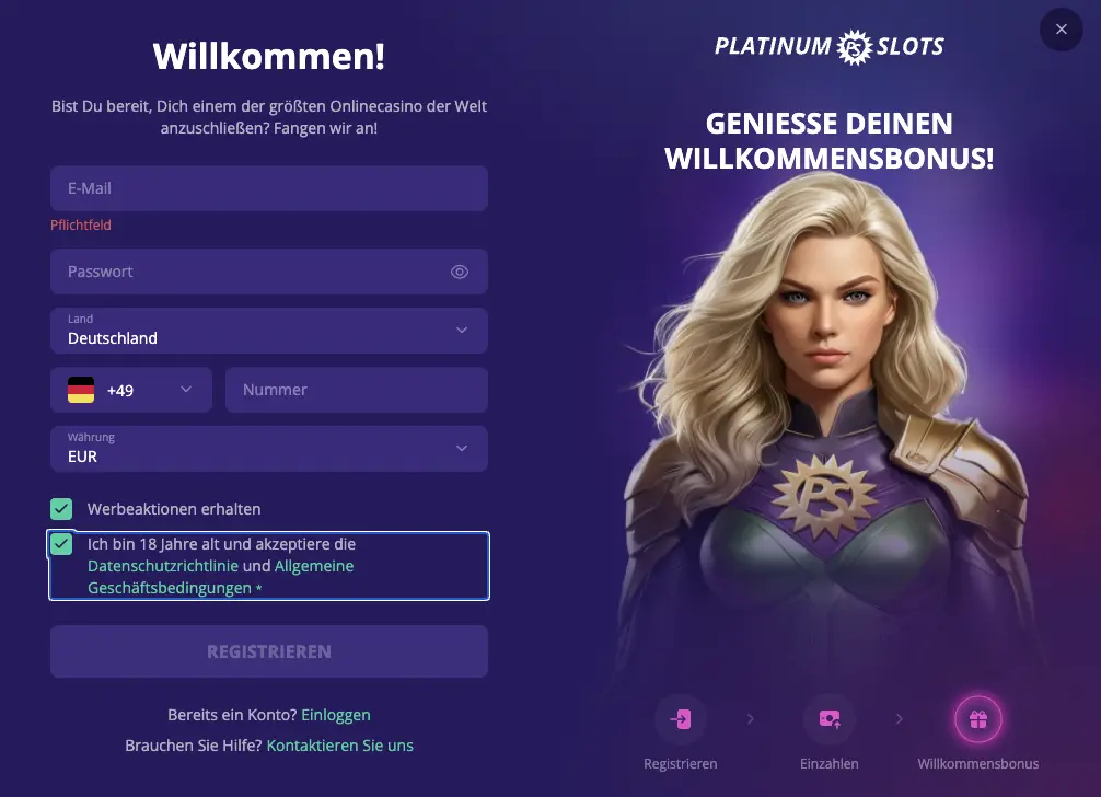 Platinumslots Anmeldung ist der Start, nach dem bei uns ein Willkommenspaket bis zu 10.000 € und 450 Gratis Spins und andere Angebote gewinnen kann. Gemeint ist die Registrierung, die in Deutschland ausdrücklich möglich ist. Ein Konto wird innerhalb von wenigen Minuten angelegt und über dieses haben unsere Kunden die Gelegenheit, Zahlungen zu veranlassen und sich für einen Einsatz im Spiel ihrer Wahl zu entscheiden. Der spätere Zugriff erfolgt durch den Login, der bei uns über eine hinterlegte Mail-Adresse und über ein Passwort vorgenommen wird. Die verschiedenen Vorgänge inklusive der Verifizierung erklären wir hier.