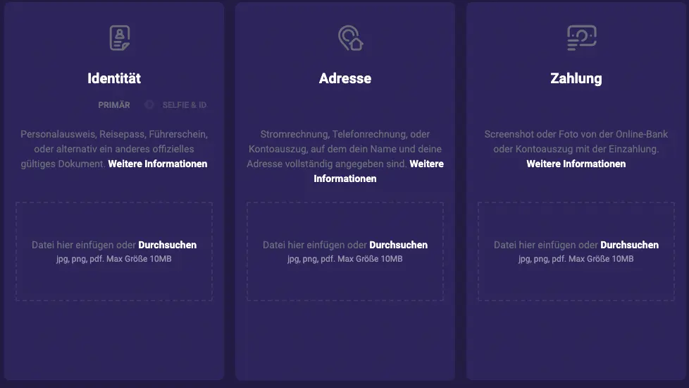 Nach der Platinumslots Registration erfolgt auf einem Informationsbildschirm der Hinweis, dass eine Verifizierung veranlasst werden soll. Das ist nur ein Hinweis, keine Aufforderung. Gemeint ist mit diesem Wort, dass die hinterlegten persönlichen Daten überprüft werden. So wird Geldwäsche vermieden. Allerdings ist die Angabe persönlicher Angaben kein Teil des Registrierungsprozesses. Vorgenommen werden kann alles zum gewünschten Zeitpunkt, ebenso wie die Verifizierung durch das Hochladen beispielsweise des Personalausweises und von Dokumenten mit der bei uns hinterlegten Adresse und einem aktuellen Datum. Es besteht zwar keine sofortige Verpflichtung, aber vor einer ersten größeren Auszahlung sollte der Prozess abgeschlossen sein. Die Überprüfung dauert vermutlich einen oder zwei Tage.